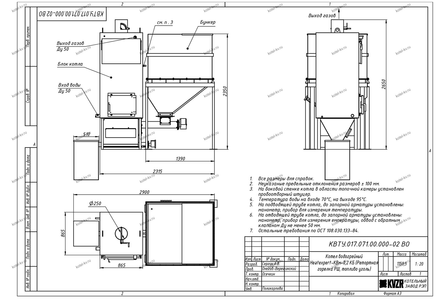 Конструкция автоматического котла на угле 200 кВт